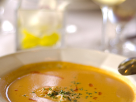 Leckere Kürbissuppe mit Apfel und Ingwer abgeschmeckt.